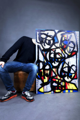 Arthur Simony choisit un mot, un poème ou une prière existante ou qu’il invente, et l’appose sur la toile avec un style bien à lui.